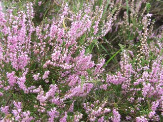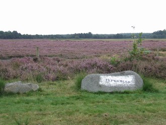 na een kilometer uit over de heide die in bloei staat.
