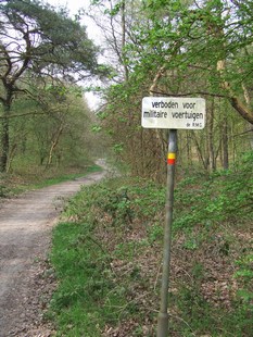 Uffelterzand. Het bordje 'verboden voor millitaire voertuigen'