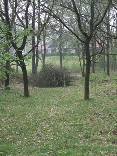 Het is wat heiig, maar het is goed te zien hoeveel hoogteverschillen er hier zijn. (op de foto niet zo goed te zien) De rust, de zingende vogels en het flets zonnetje geven een mystieke sfeer. We zijn om 12.30 bij het Hunehuis van het Nivon, de uitgever van onder meer het Drenthepad. Het ligt prachtig tegen een heuvel! We vragen ons af hoe het overnachten in zo'n huis tegenwoordig gaat. Het lijkt op een jeugdherberg, maar ook dat is anders dan het jaren geleden was....