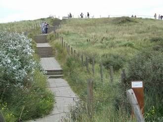 Na enkele kilometers komen we dan via een trap weer op de duinen,