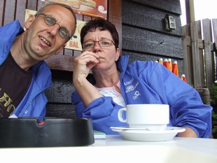 Het weer is bewolkt, maar droog. We kunnen dus lekker los. Na 3 kilometer blijkt een routeaanwijzing niet te kloppen. Niet zo erg op zich, maar ook een markering ontbreekt ter plekke. We moeten bij een huis met nummer 31 naar links, maar daar blijkt alleen een sloot te zijn. Het kaartje was juist en het genoemde huisnummer had 39 moeten zijn. Nou niet heel erg, 'maar' 400 meter extra gemaakt. Een kilometertje verderop besluiten we om een kopje cappucino te scoren op een terras.