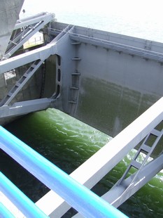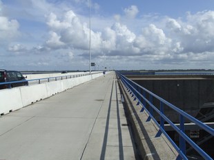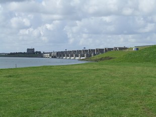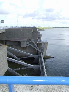zicht op de schuivenconstructie van de Haringvlietdam.
