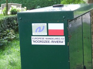 bewandelen. Op de sticker wordt ook de europese route E2: Noordzee-Riviera