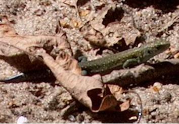 Na een klein stukje lopen zagen we een hagedisje (ca. 15-20 cm) over het pad schieten. Wie weet welk soort het is mag het zeggen...