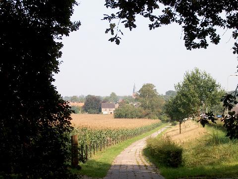 Via het voetpad naar het dorp gelopen, waar de auto geparkeerd stond.