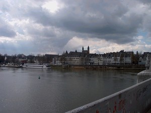 Op het station van Maastricht eten we op het perron onze broodjes op. De overkapping zal ervoor zorgen dat het droog blijft. Het was achteraf niet echt nodig, want er kwam geen regen. Om 12.50 uur vertrekken we richting de Maas en vervolgens bergop naar de Sint Pietersberg. Aangekomen op de Sint Servaasbrug krijgen we behalve zicht op enkele rondvaartboten het doel van deze etappe, ja zelfs het Pieterpad in zicht!