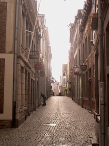 Net over de brug begint het weer te spetteren. We toveren de paraplus weer tevoorschijn, maar het blijkt loos alarm. Het blijft bij enkele spatjes. We komen door enkele mooie straatjes aan de rand van het centrum van de stad.