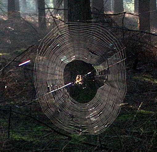Door de ochtendnevel was het plannetje van de spin om een onzichtbaar vangnet te maken mislukt. Door de vochtdruppels was de spinneweb (of is het tegenwoordig spinnenweb?) van grote afstand al te zien.