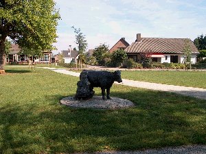 Op het plantsoen tegenover het klooster was nog een mooi beeldje van een vrouw die bezig is een koe te melken.
