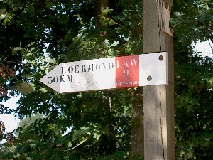Bij het ingaan van de laatste vier kilometers van deze etappe kwamen we nog een wegwijzer tegen, waarop Roermond wordt aangeduid.