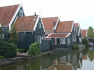 zien we de draaiende molens van de Zaanse Schans. De achtergrond van de