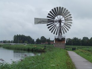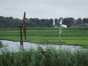 watermolentjes in de polder draaien nauwelijks vanwege de zwakke wind,