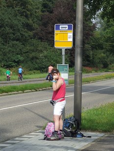 bushalte. Enkele minuten eerder zagen we al een bus voorbij rijden. Dit